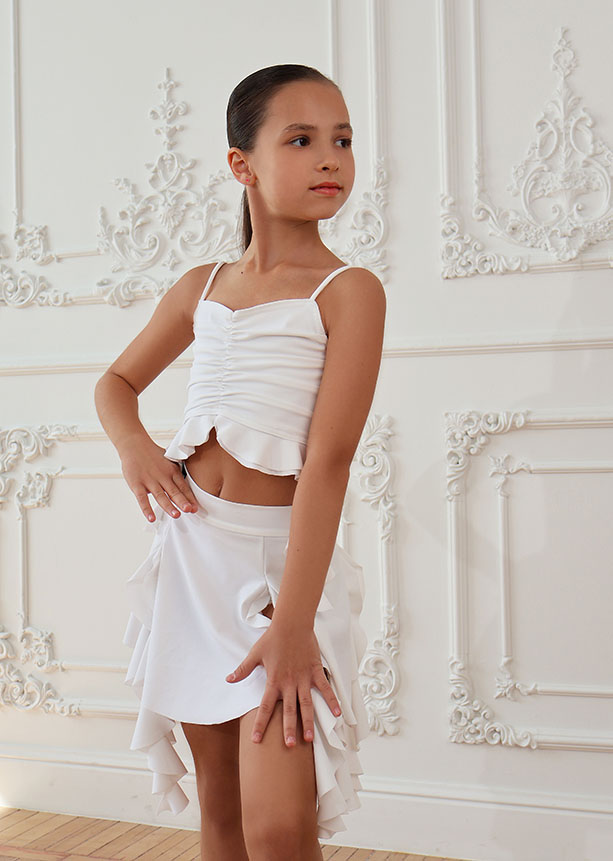 Топ с изящной драпировкой и воланами создаёт игривый и женственный силуэт, идеально облегает фигуру, не сковывая движения. Топ соответствует последним модным тенденциям в танцевальной одежде, что позволит тебе всегда выглядеть стильно и современно. Он станет отличным выбором для занятий бальными танцами, хореографией, современной и эстрадной танцевальными направлениями.