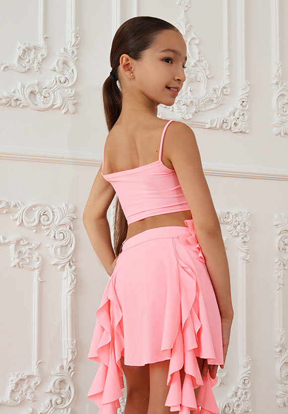 Топ с изящной драпировкой и воланами создаёт игривый и женственный силуэт, идеально облегает фигуру, не сковывая движения. Топ соответствует последним модным тенденциям в танцевальной одежде, что позволит тебе всегда выглядеть стильно и современно. Он станет отличным выбором для занятий бальными танцами, хореографией, современной и эстрадной танцевальными направлениями.