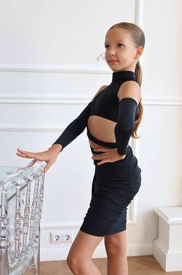 Топ классического черного цвета с ассиметричным поясом, благодаря которому получаются будто дерзкие вырезы на талии и создается запоминающийся и выразительный образ. Высокая горловина добавляет утонченности и элегантности. Эластичная ткань обеспечивает максимальный комфорт и не сковывает движения во время исполнения самых сложных элементов. Топ идеально облегает фигуру, подчеркивая достоинства и позволяя юной танцовщице чувствовать себя уверенно на паркете.
