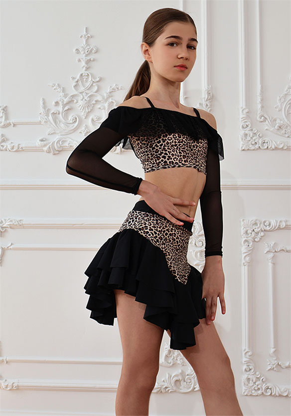 Элегантная черная юбка с леопардовой кокеткой, подчеркивает вашу грацию и динамику на танцевальной площадке. Многослойные воланы придают ей пышность, объем и легкость, заставляя каждый ваш шаг буквально парить в воздухе.